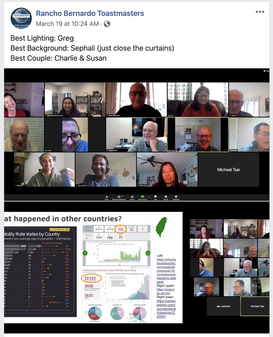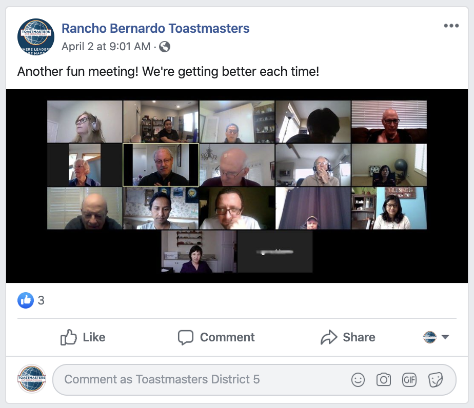 View Larger Image View Larger Image View Larger Image View Larger Image View Larger Image Rancho Bernardo ToastmastersKris2020-04-18T14:58:07-07:00 Project Description Rancho Bernardo Toastmasters Toastmasters Club 112 Meets: Thursdays 7am Location: Online April – June, 2020 https://www.facebook.com/RBToastmastersClub/ Share This Story, Choose Your Platform! facebooktwitterlinkedinreddittumblrpinterestvkEmail